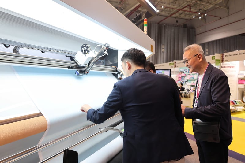 Khách tham quan tìm hiểu giải pháp kiểm tra, giám sát chất lượng vải bằng máy móc, phản ánh xu hướng "sản xuất xanh và thông minh" mà ngành dệt may đang theo đuổi.