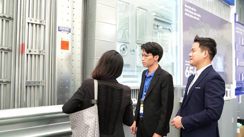 Ông Hồ Sỹ Tài: Gian hàng của Tôn Nam Kim tại hội chợ giới thiệu dòng sản phẩm chủ lực Zinmag - tôn mạ hợp kim 3% Magie, được chúng tôi nghiên cứu và phát triển hoàn toàn tại Việt Nam. Sản phẩm có khả năng tự trám bề mặt cắt, độ bền vượt trội và tuổi thọ lên đến trên 50 năm, đáp ứng yêu cầu khắt khe của các công trình lớn và các đối tác quốc tế.