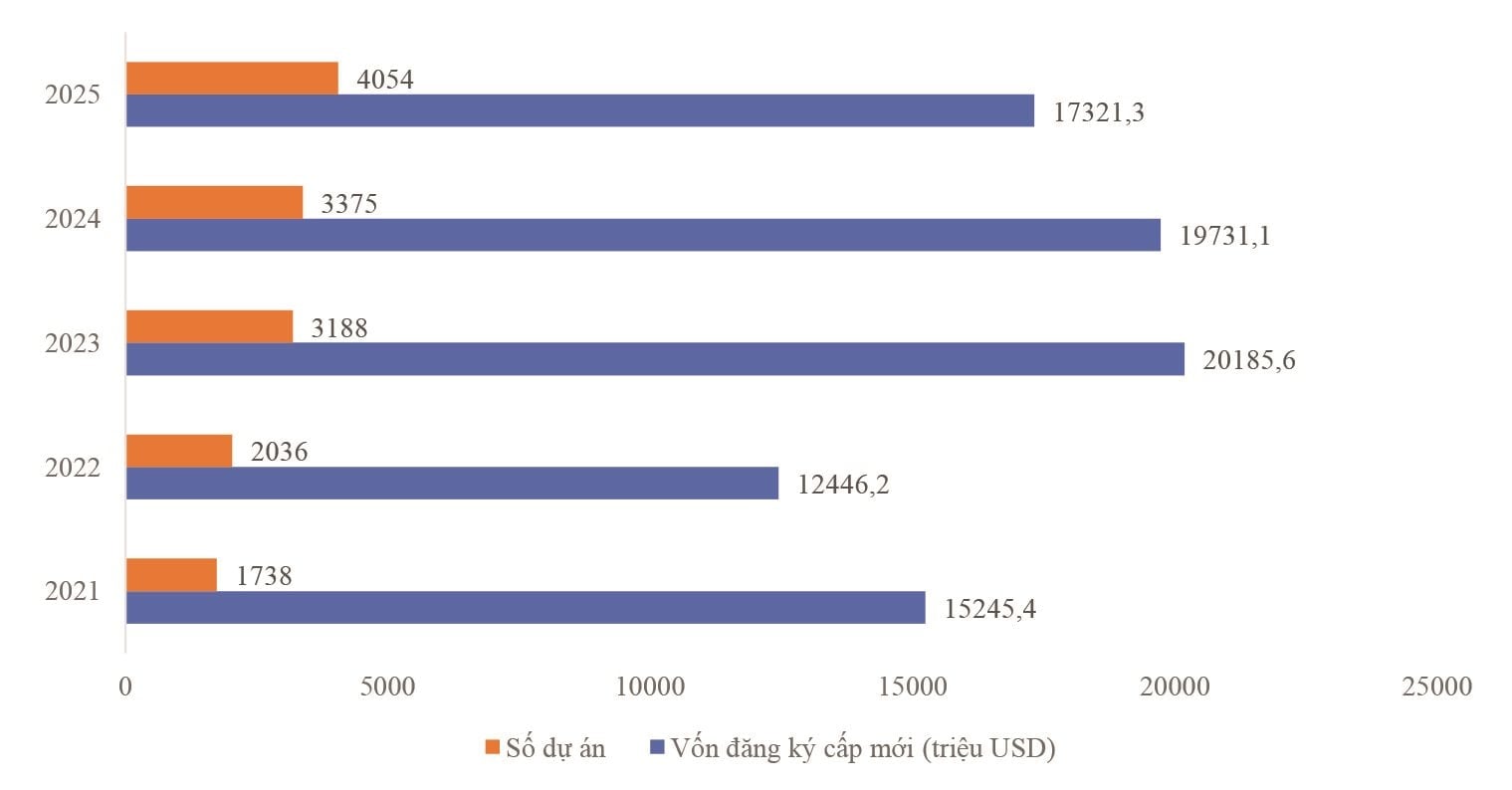Hình 7. Số dự án và tổng vốn đầu tư nước ngoài đăng ký cấp mới giai đoạn 2021-2025