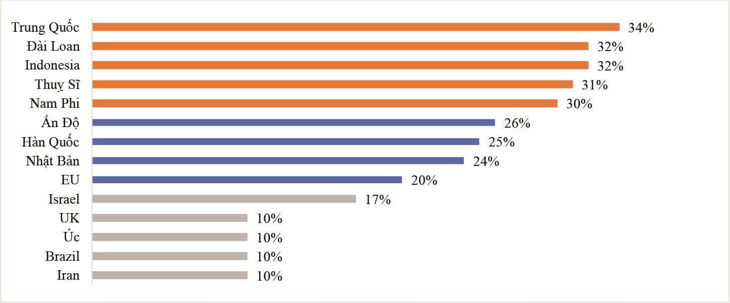 Hình 1. Mức thuế đối ứng Mỹ áp lên hàng hoá nhập khẩu của một số quốc gia và vùng lãnh thổ (tháng 4/2025)