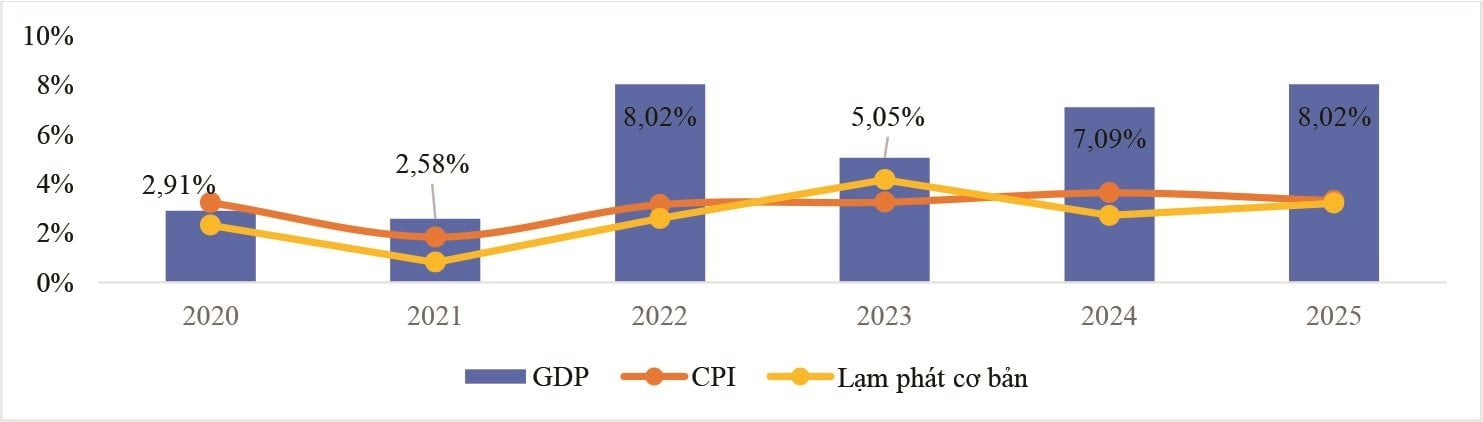 Hình 3. Tăng trưởng GDP, chỉ số giá tiêu dùng (CPI) và lạm phát cơ bản của Việt Nam giai đoạn 2020-2025 (%)