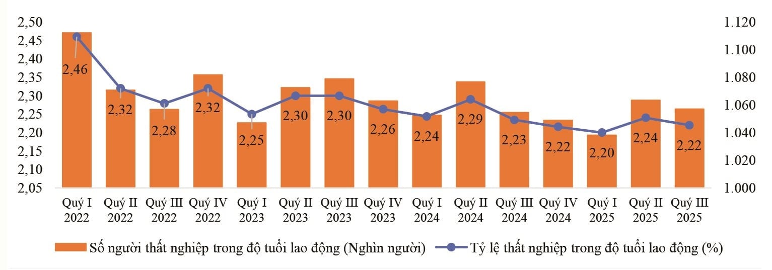 Về tình hình việc làm, theo Cục Thống kê, tỷ lệ thất nghiệp trong độ tuổi lao động quý IV/2025 là 2,22%, tăng 0,01 điểm phần trăm so với quý trước và không đổi so với cùng kỳ năm trước (Hình 4). Tỷ lệ thất nghiệp trong độ tuổi lao động năm 2025 là 2,22%, giảm 0,02 điểm phần trăm so với năm trước, trong đó khu vực thành thị là 2,51%; khu vực nông thôn là 2,02%. IMF (2025) ước tính tỷ lệ thất nghiệp chỉ khoảng 2,3% năm 2025 và 2,5% năm 2026. Số lao động đang làm việc trong các doanh nghiệp công nghiệp tại thời điểm ngày 1/12/2025 tăng 0,8% so với cùng thời điểm tháng trước và tăng 2,4% so với cùng thời điểm năm trước. Nhìn chung, trong năm 2025, Việt Nam tiếp tục xu hướng gia tăng sử dụng, tuyển dụng lao động, giảm thiểu tình trạng thất nghiệp, nhưng vẫn còn hiện tượng lao động thiếu việc làm, việc làm phi chính thức.