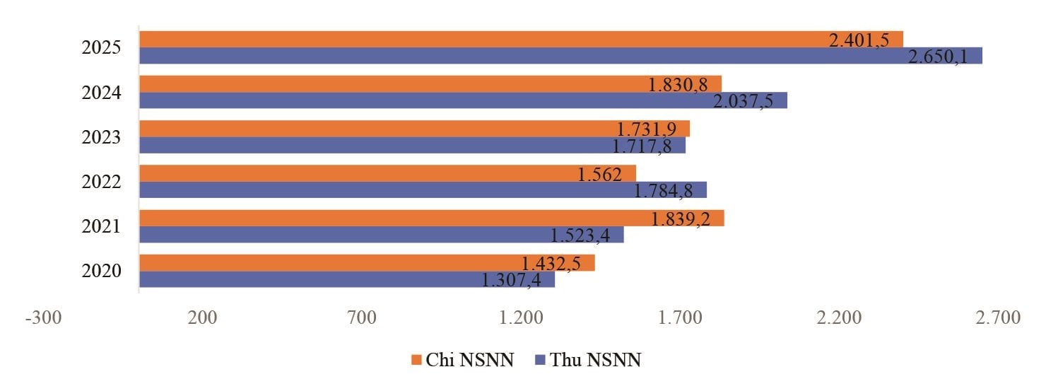 Hình 5. Tổng thu, chi NSNN giai đoạn 2020-2025 (nghìn tỷ đồng)