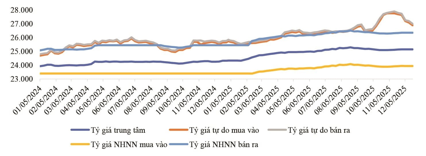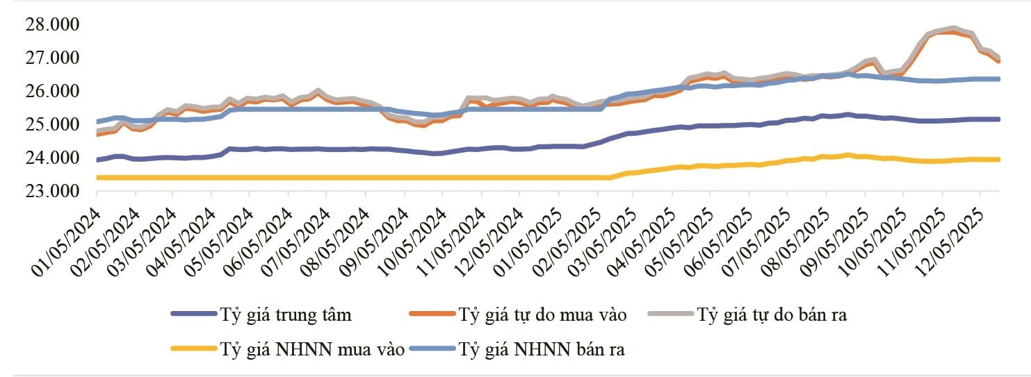 Từ khoảng giữa năm 2025, tỷ giá VND/USD bắt đầu có dấu hiệu đi ngang và ổn định hơn so với đà tăng mạnh của cuối năm 2024. Tỷ giá trung tâm tiếp tục duy trì đà tăng nhẹ nhưng ổn định quanh mức 25.000 VND/USD, tạo hành lang pháp lý cho các ngân hàng thương mại giao dịch. Khoảng cách giữa tỷ giá tự do và tỷ giá chính thức có xu hướng thu hẹp lại, cho thấy các chính sách điều hành của Ngân hàng Nhà nước (NHNN) đã bắt đầu phát huy tác dụng kiểm soát tâm lý đầu cơ. VND vẫn chịu sức ép mất giá nhất định so với đồng USD do bối cảnh kinh tế toàn cầu như chính sách tiền tệ của Mỹ, căng thẳng thương mại kéo dài, suy giảm cầu tại Mỹ, EU, Trung Quốc. Tuy nhiên, mức mất giá vẫn nằm trong tầm kiểm soát (khoảng 3-4%). Nguồn cung ngoại tệ từ FDI, kiều hối và thặng dư thương mại trong năm 2025 dự kiến vẫn khả quan, giúp NHNN có thêm dư địa để can thiệp thị trường khi cần thiết.