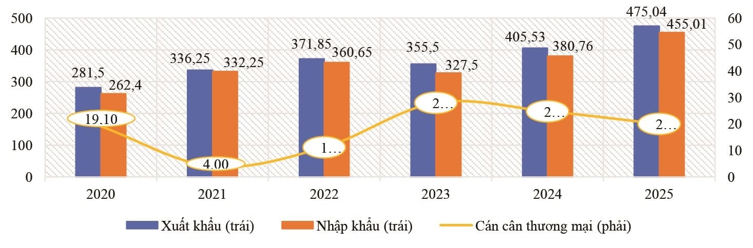 Hình 6. Xuất nhập khẩu của Việt Nam giai đoạn 2020 – 2025 (tỷ USD)