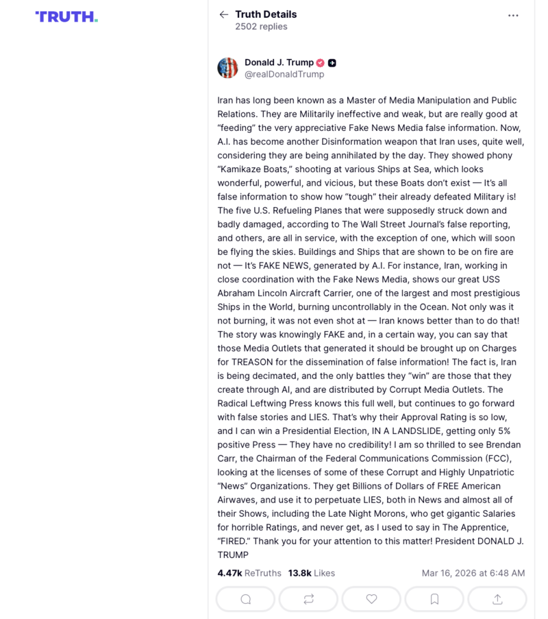 Trong một bài đăng trên nền tảng mạng xã hội Truth Social vào sáng 16/3, Tổng thống Mỹ Donald Trump nhận định Iran từ lâu đã chú trọng đến hoạt động truyền thông và quan hệ công chúng, đồng thời cho rằng các công nghệ mới như AI đang được sử dụng để tạo ra và phát tán những hình ảnh, thông tin không chính xác về tình hình trên thực địa.