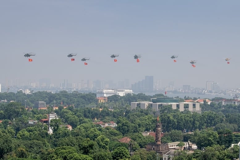 | Biên đội trực thăng Mi-171, Mi-17, Mi-8, mang cờ Đảng, cờ Tổ quốc tung bay trên Quảng trường Ba Đình lịch sử - Ảnh: VGP |