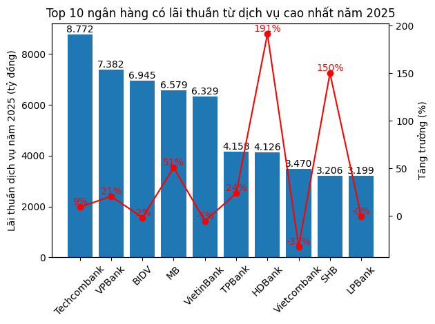 Top 10 ngân hàng lãi dịch vụ cao nhất 2025: Các ông lớn biến động thứ hạng