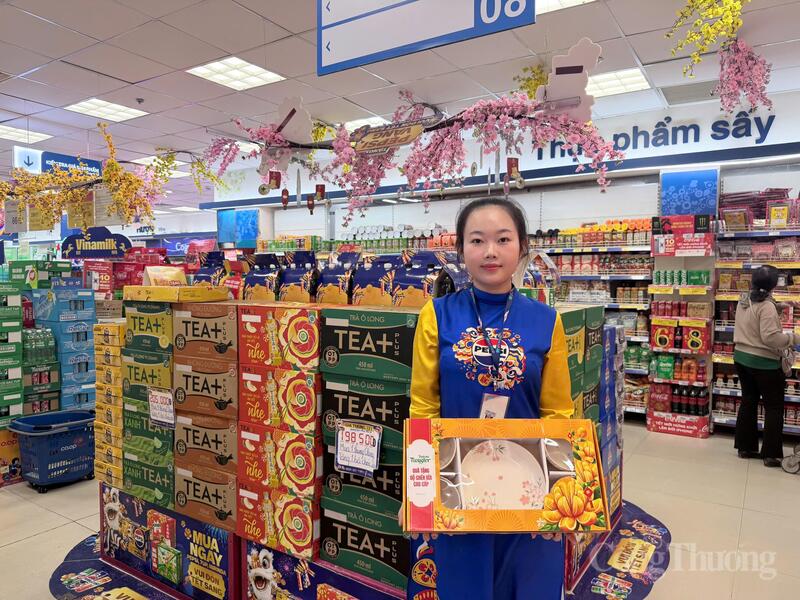 Nhân viên tiếp thị giới thiệu các dòng sản phẩm Tết với bao bì rực rỡ và chính sách giá ưu đãi tại siêu thị. Ảnh: Minh Anh.