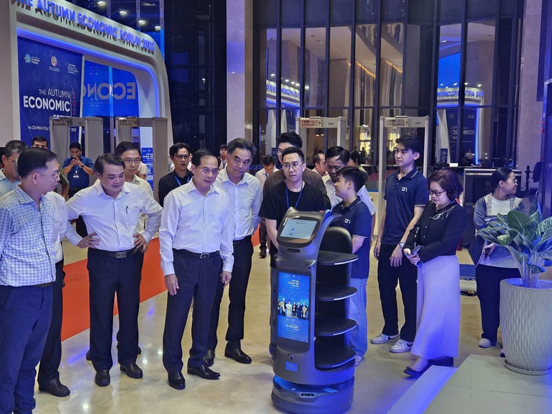 Phó Thủ tướng Bùi Thanh Sơn trao đổi với nhóm kỹ sư trẻ về khả năng vận hành, trình diễn robot AI tại diễn đàn. Ảnh: Minh Khuê.