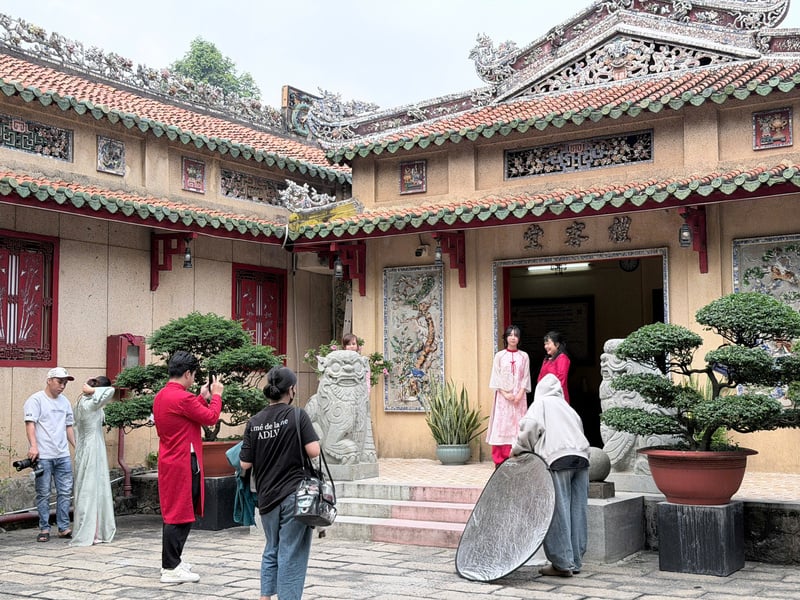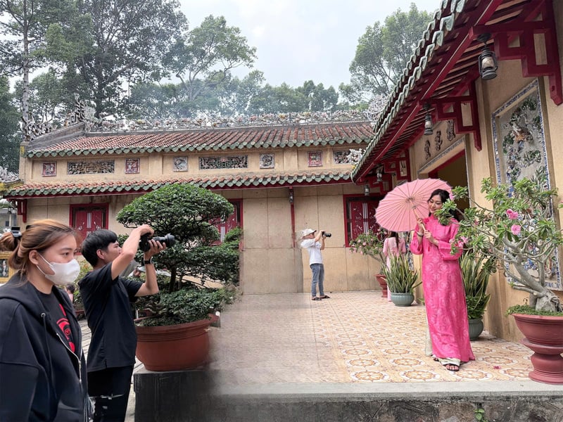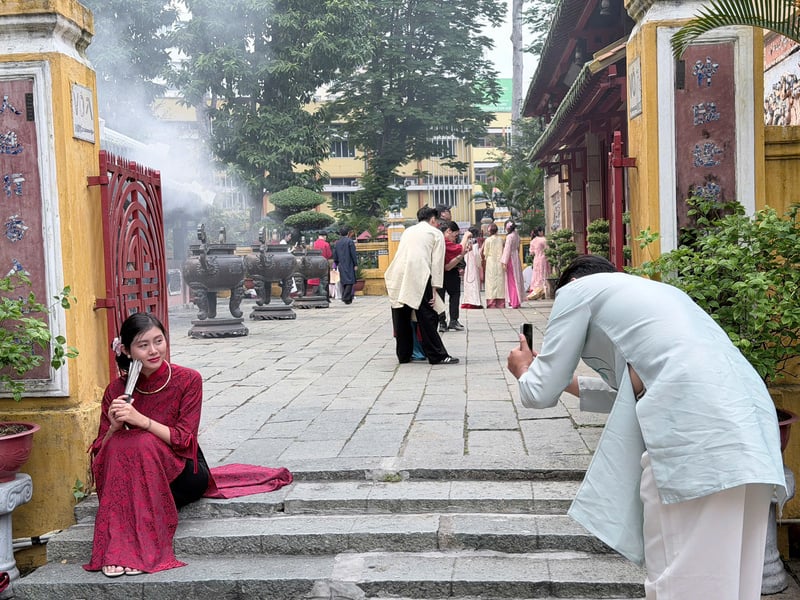 Không chỉ đến thắp nhang, cầu an, nhiều người còn diện áo dài, chụp ảnh, xem đây như một cách “bắt nhịp” Tết sớm giữa lòng thành phố.
