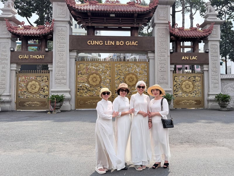 Nhóm du khách trung niên duyên dáng trong tà áo dài trắng tinh khôi, check-in trước cổng chùa. Ảnh: Minh Anh