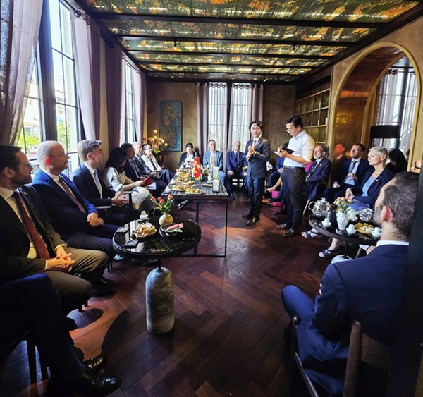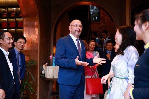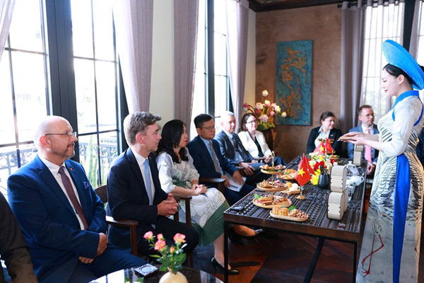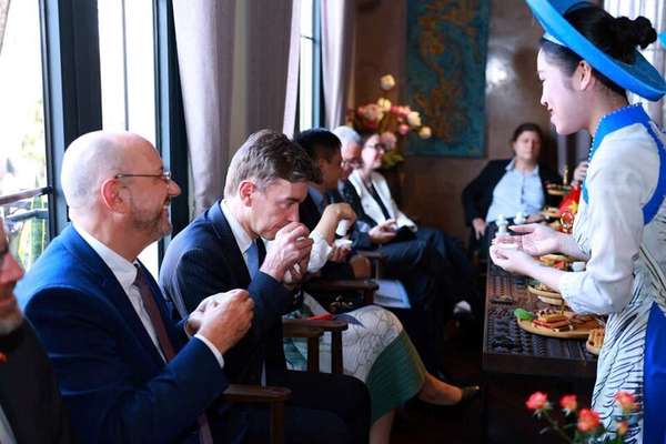 Giữa không gian đậm chất lịch sử, văn hóa, nghệ thuật, vừa trang trọng nhưng không kém phần ấm cúng, những vị khách quý đã có dịp gác lại những nghi thức ngoại giao thường thấy để cùng nhau thưởng thức những tách trà và chia sẻ những câu chuyện cởi mở, chân tình. Các vị đại sứ đã trao đổi những câu chuyện thú vị về sự kết nối giữa các nền văn hóa, đồng thời đưa ra những gợi ý bất ngờ và đầy sáng tạo, chẳng hạn như sự kết hợp độc đáo khi dùng mì Ý với trà Việt hay trà Việt với Sô cô la…