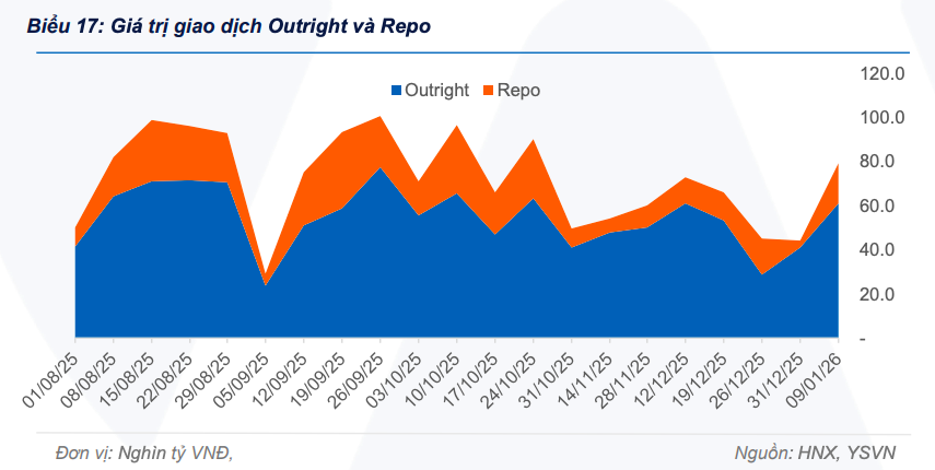 margin: 15px auto;" />Theo thống kê tuần từ ngày 5/1 đến 9/1/2026 của Chứng khoán Yuanta Việt Nam tổng giá trị giao dịch trên thị trường trái phiếu Chính phủ đạt khoảng 79,5 nghìn tỷ đồng, tăng hơn 69% so với tuần cuối cùng của năm 2025. Động lực tăng thanh khoản đến từ cả hai hình thức giao dịch outright và repo. Trong đó, giao dịch outright đạt khoảng 61 nghìn tỷ đồng, tăng gần 50% so với tuần trước, còn giao dịch repo đạt 18,6 nghìn tỷ đồng, tăng hơn 4 lần so với tuần liền trước.