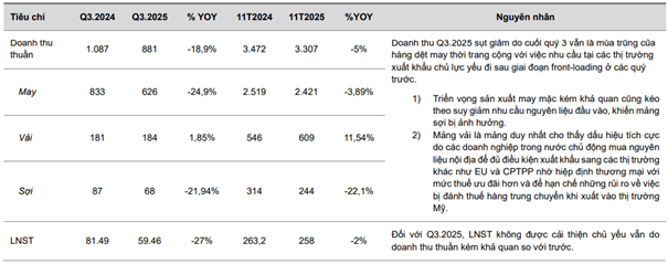 margin: 15px auto;" />Theo báo cáo cập nhật do VCBS vừa phát hành, những con số kinh doanh quý III/2025 và triển vọng năm 2026 của TCM cho thấy doanh nghiệp vẫn chưa thoát khỏi trạng thái “chờ chu kỳ”, trong bối cảnh thuế quan, sức mua yếu và cạnh tranh giá tiếp tục đè nặng lên toàn ngành dệt may.