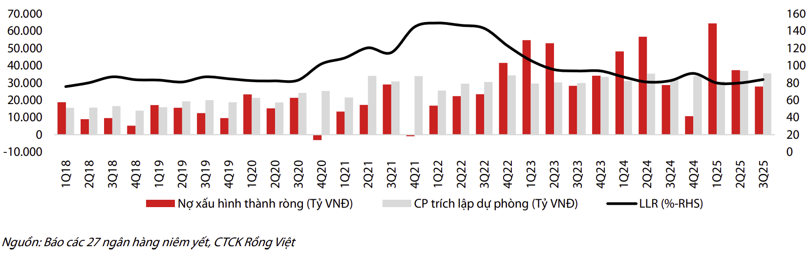 margin: 15px auto;" />Bối cảnh pháp lý liên quan đến các dự án bất động sản và năng lượng tái tạo đã được tháo gỡ một phần trong năm 2025, cùng với tăng trưởng kinh tế cải thiện, được đánh giá là các yếu tố hỗ trợ chất lượng tín dụng. VDSC dự báo nợ xấu hình thành ròng quý IV/2025 sẽ tiếp tục giảm so với quý III, kéo tỷ lệ nợ xấu toàn danh mục xuống còn 1,8-1,9%, thấp hơn 10–20 điểm cơ bản so với cuối quý trước.