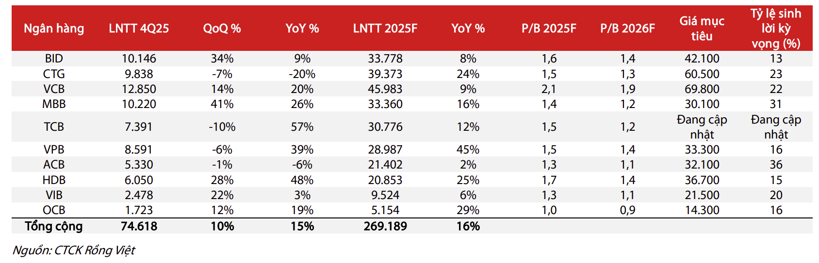 Về kết quả kinh doanh, VDSC dự báo tổng thu nhập hoạt động của các ngân hàng mà VDSC theo dõi tăng 7% so với cùng kỳ, trong khi lợi nhuận trước thuế quý IV/2025 tăng 15% so với cùng kỳ, đưa tăng trưởng lợi nhuận cả năm 2025 lên mức 15%.