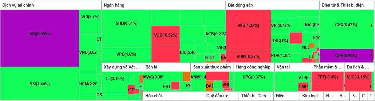 Trụ lớn suy yếu, VN-Index giữ nhịp tăng nhờ cổ phiếu chứng khoán và nhóm Gelex