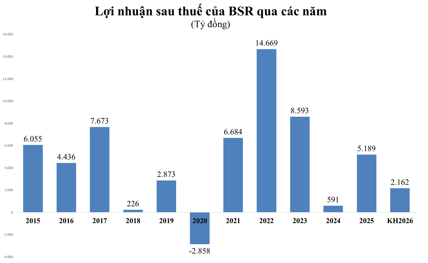 Sau giai đoạn bùng nổ lợi nhuận nhờ giá dầu tăng mạnh, đạt mức đỉnh 14.726 tỷ đồng vào năm 2022 (trên nền doanh thu kỷ lục 167.124 tỷ đồng), kết quả kinh doanh của BSR có xu hướng hạ nhiệt, thậm chí lợi nhuận giảm về 591 tỷ đồng (năm 2024), trước khi hồi phục về 5.189 tỷ đồng vào năm 2025 vừa qua.