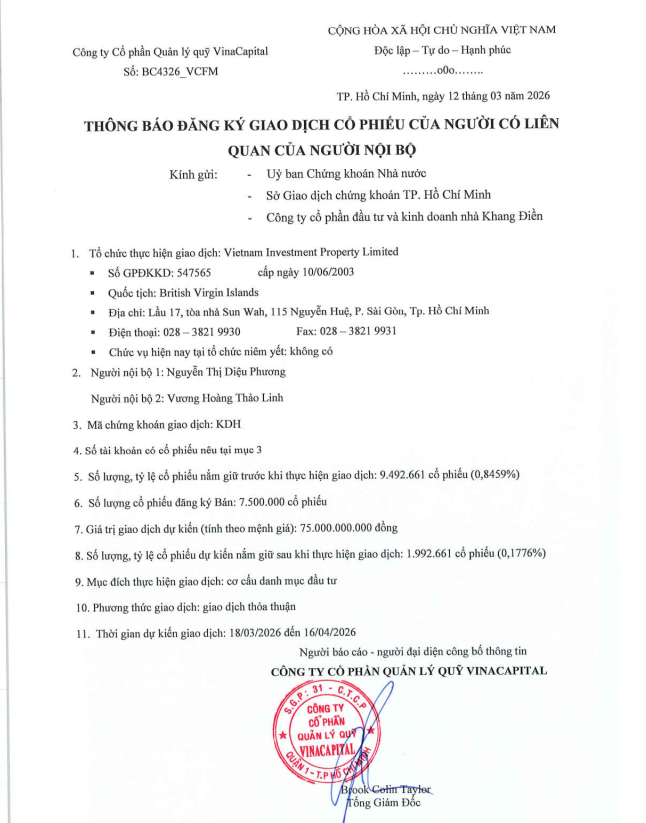 Theo nội dung công bố, Vietnam Investment Property Limited dự kiến bán ra 7,5 triệu cổ phiếu KDH nhằm thực hiện cơ cấu lại danh mục đầu tư. Giao dịch được lên kế hoạch thực hiện theo phương thức thỏa thuận trong khoảng thời gian từ ngày 18/3/2026 đến ngày 16/4/2026.