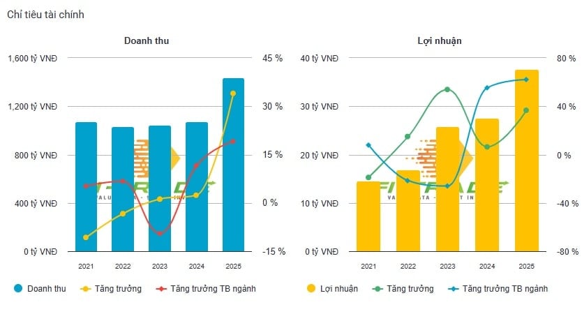Lợi nhuận thuần từ hoạt động kinh doanh đạt 48,2 tỷ đồng, tăng so với mức 30,9 tỷ đồng của năm 2024. Lợi nhuận trước thuế đạt hơn 50 tỷ đồng, trong khi lợi nhuận sau thuế đạt khoảng 37,7 tỷ đồng, tăng so với mức 27,6 tỷ đồng cùng kỳ. Lãi cơ bản trên cổ phiếu (EPS) đạt 3.848 đồng, cao hơn mức 2.505 đồng năm trước.