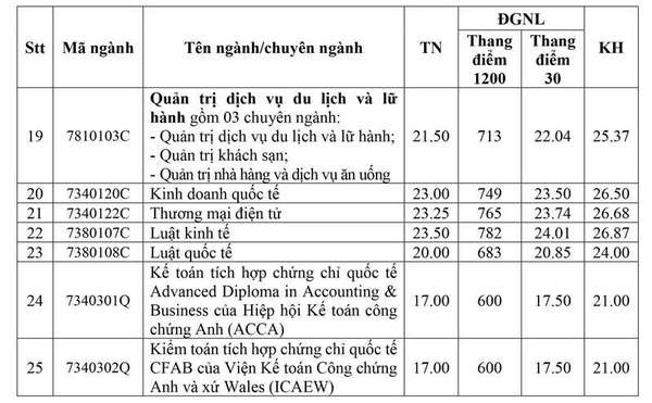 Ở chiều ngược lại, thấp nhất là các ngành: Công nghệ thực phẩm; Kế toán; Kiểm toán; Kế toán tích hợp chứng chỉ quốc tế Advanced Diploma in Accounting & Business của Hiệp hội Kế toán công chứng Anh (ACCA); Kiểm toán tích hợp chứng chỉ quốc tế CFAB của Viện Kế toán Công chứng Anh và xứ Wales (ICAEW) cùng lấy 17 điểm, giảm 1 - 3 điểm so với năm 2024.