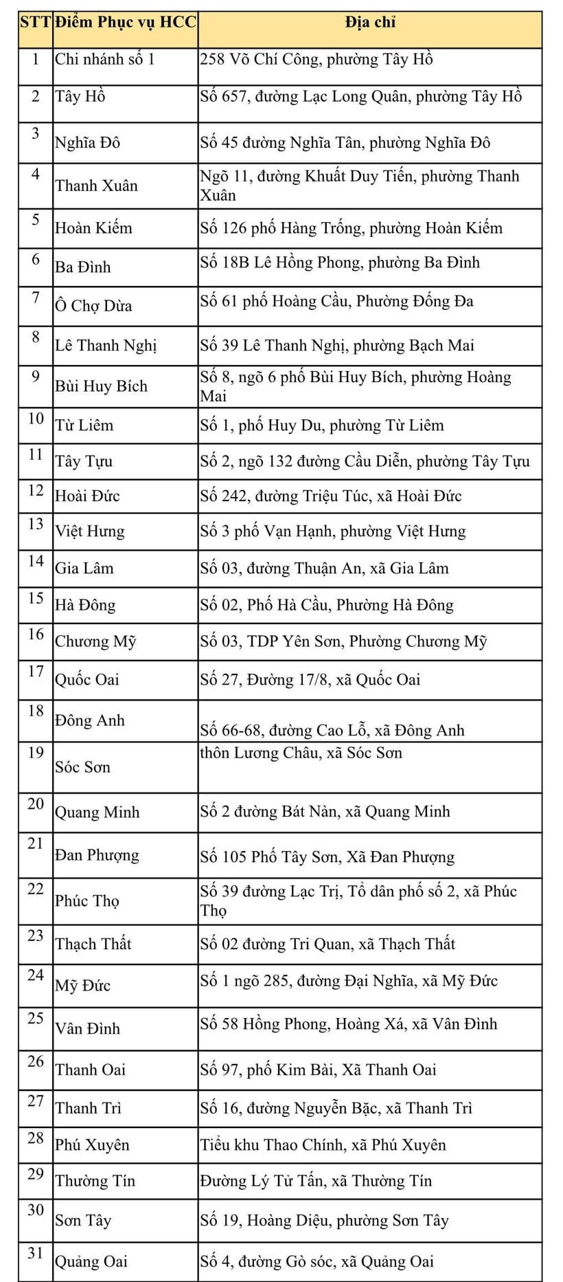 Danh sách 31 Điểm Phục vụ hành chính công tiếp nhận thủ tục hành chính thuế trên địa bàn TP. Hà Nội: