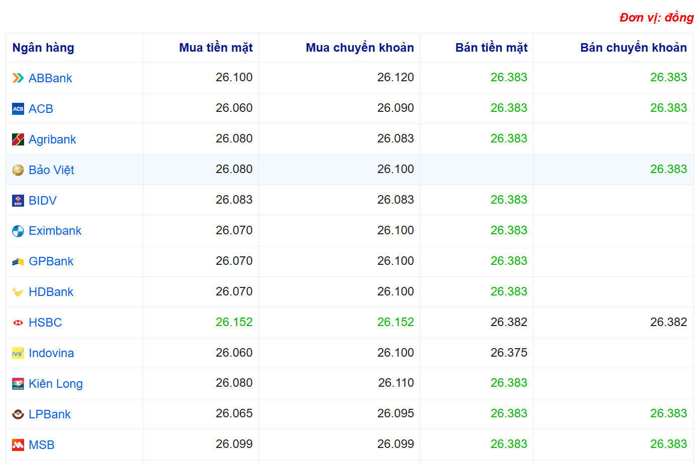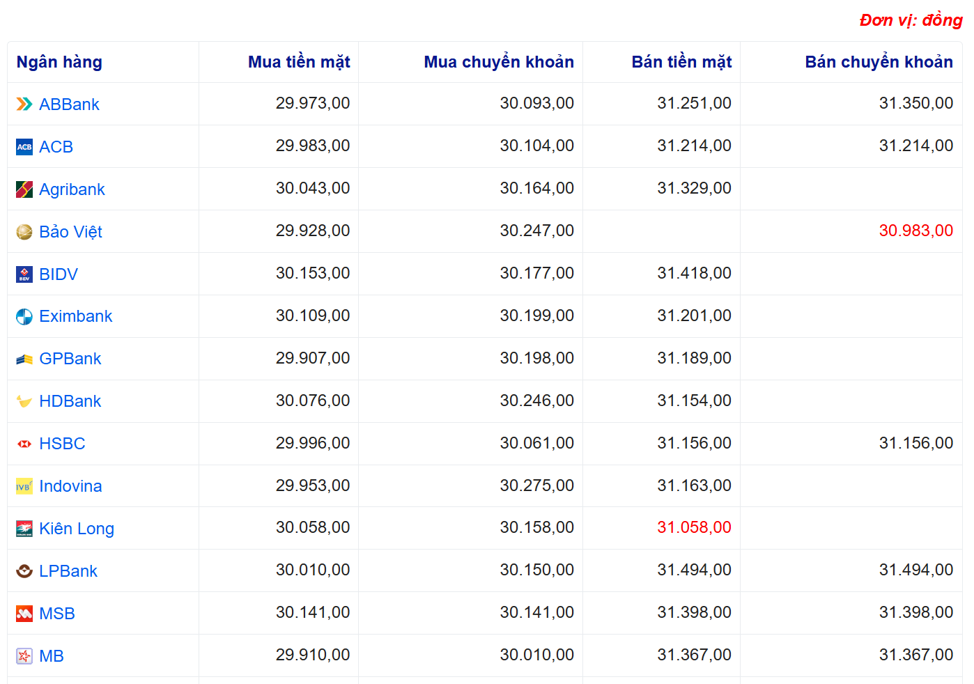 Tỷ giá USD tại một số ngân hàng: