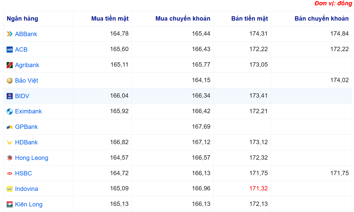Tỷ giá yên Nhật tại một số ngân hàng: