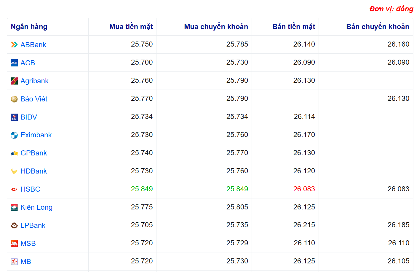 Ở thị trường trong nước, tỷ giá USD tiếp tục điều chỉnh giảm theo xu hướng quốc tế. Tại Sở giao dịch Ngân hàng Nhà nước, USD được niêm yết mua vào ở mức 23.860 đồng và bán ra 26.266 đồng. Tại các ngân hàng thương mại lớn, giá USD dao động trong biên độ hẹp, với Vietcombank giao dịch quanh 25.690 – 26.100 đồng/USD, VietinBank ở mức 25.545 – 26.085 đồng/USD và BIDV niêm yết 25.735 – 26.114 đồng/USD.