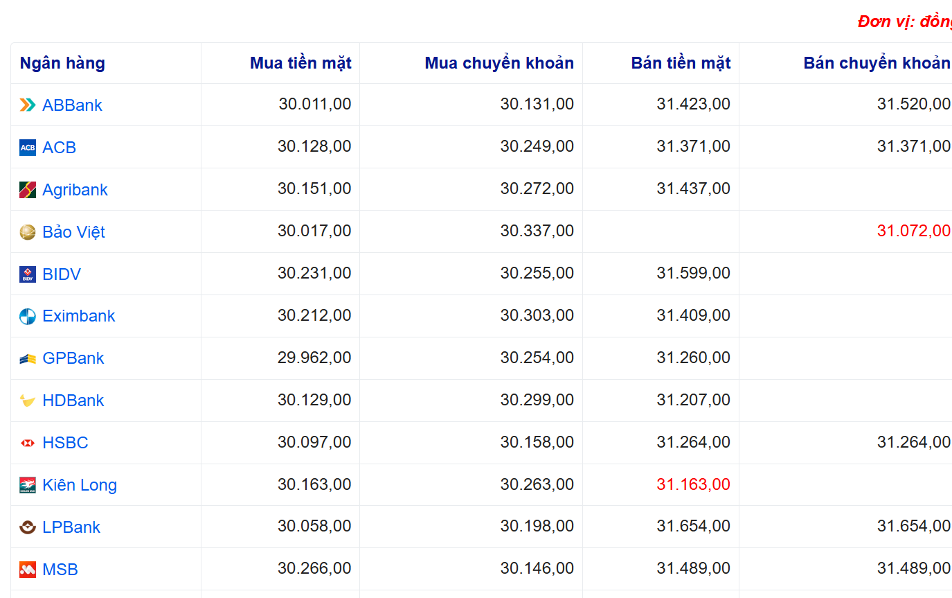 Tỷ giá yên Nhật tại một số ngân hàng: