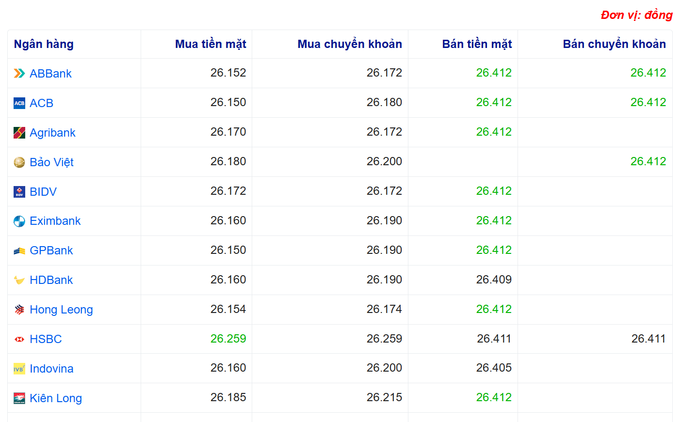 Các ngân hàng thương mại cũng duy trì mặt bằng tỷ giá quen thuộc. Vietcombank niêm yết USD ở mức 26.142 – 26.412 đồng, VietinBank giao dịch 25.995 – 26.412 đồng, trong khi BIDV giữ mức 26.172 – 26.412 đồng/USD.