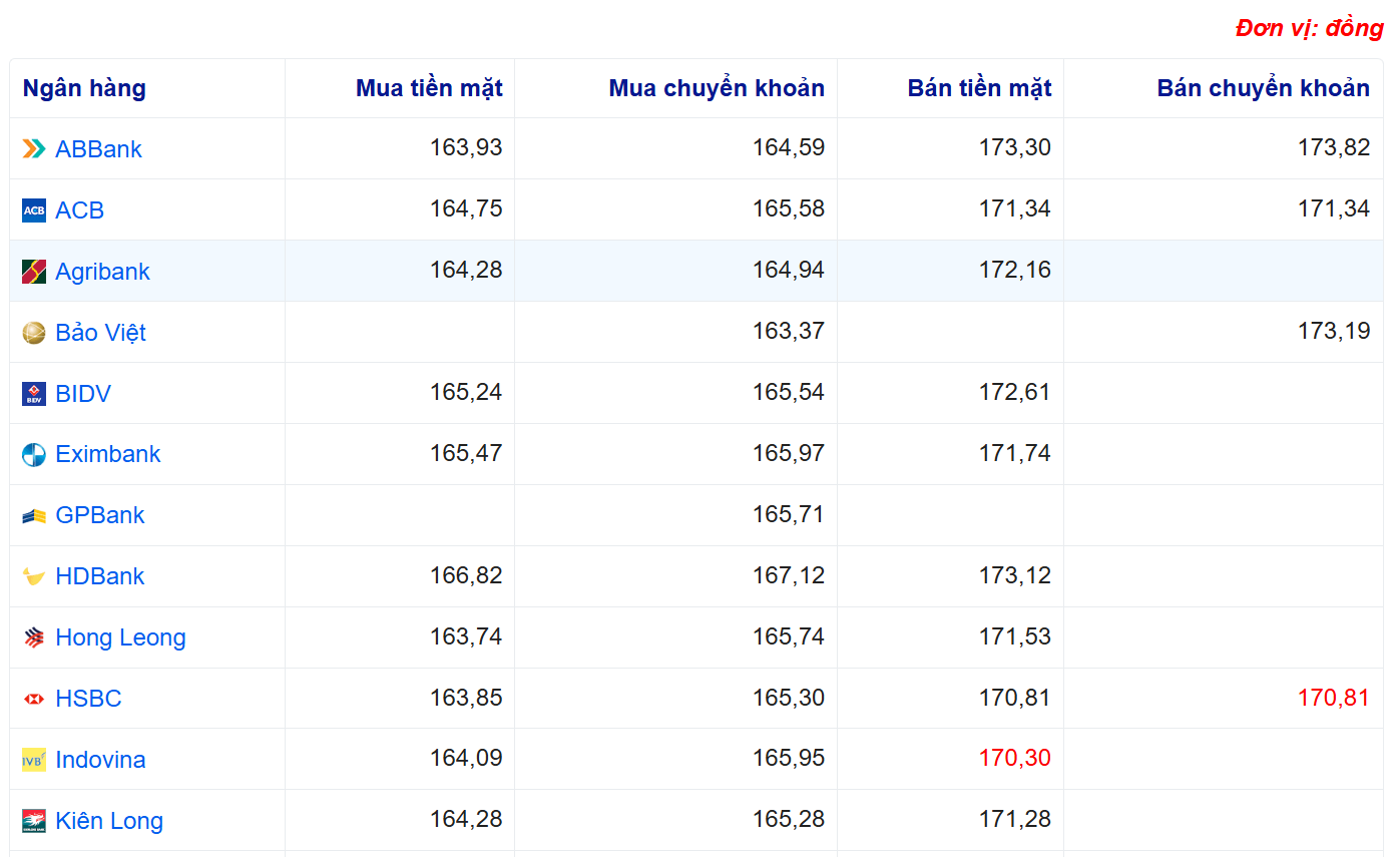 Tỷ giá yên Nhật tại một số ngân hàng: