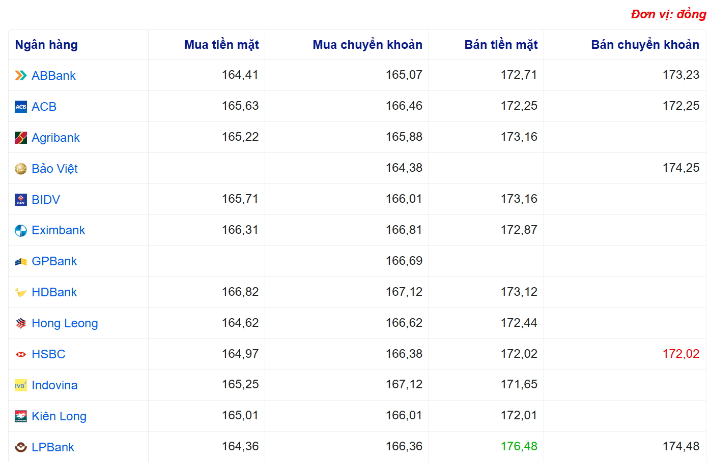 Tỷ giá yên Nhật tại một số ngân hàng: