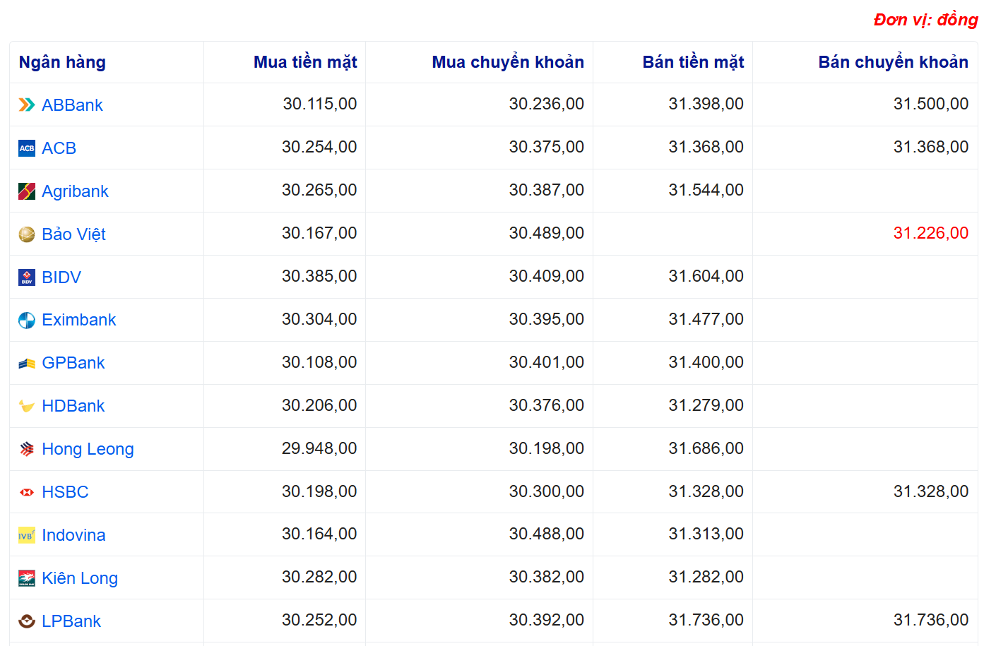 Đối với EUR, Sở giao dịch Ngân hàng Nhà nước nâng giá lên 27.973 - 30.918 đồng, trong khi tại các ngân hàng thương mại, EUR được mua vào - bán ra quanh 29.980 - 31.700 đồng.
