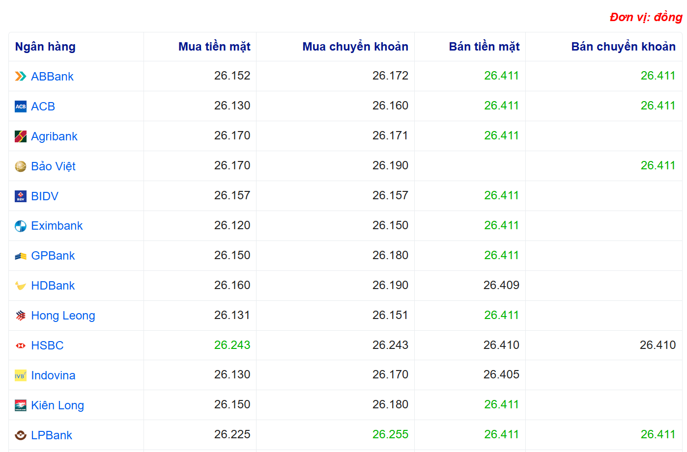 Các ngân hàng thương mại tiếp tục điều chỉnh tỷ giá theo hướng giảm. Vietcombank giao dịch USD ở mức 26.111 - 26.411 đồng, VietinBank niêm yết 25.960 - 26.411 đồng, còn BIDV ghi nhận 26.157 - 26.411 đồng/USD.