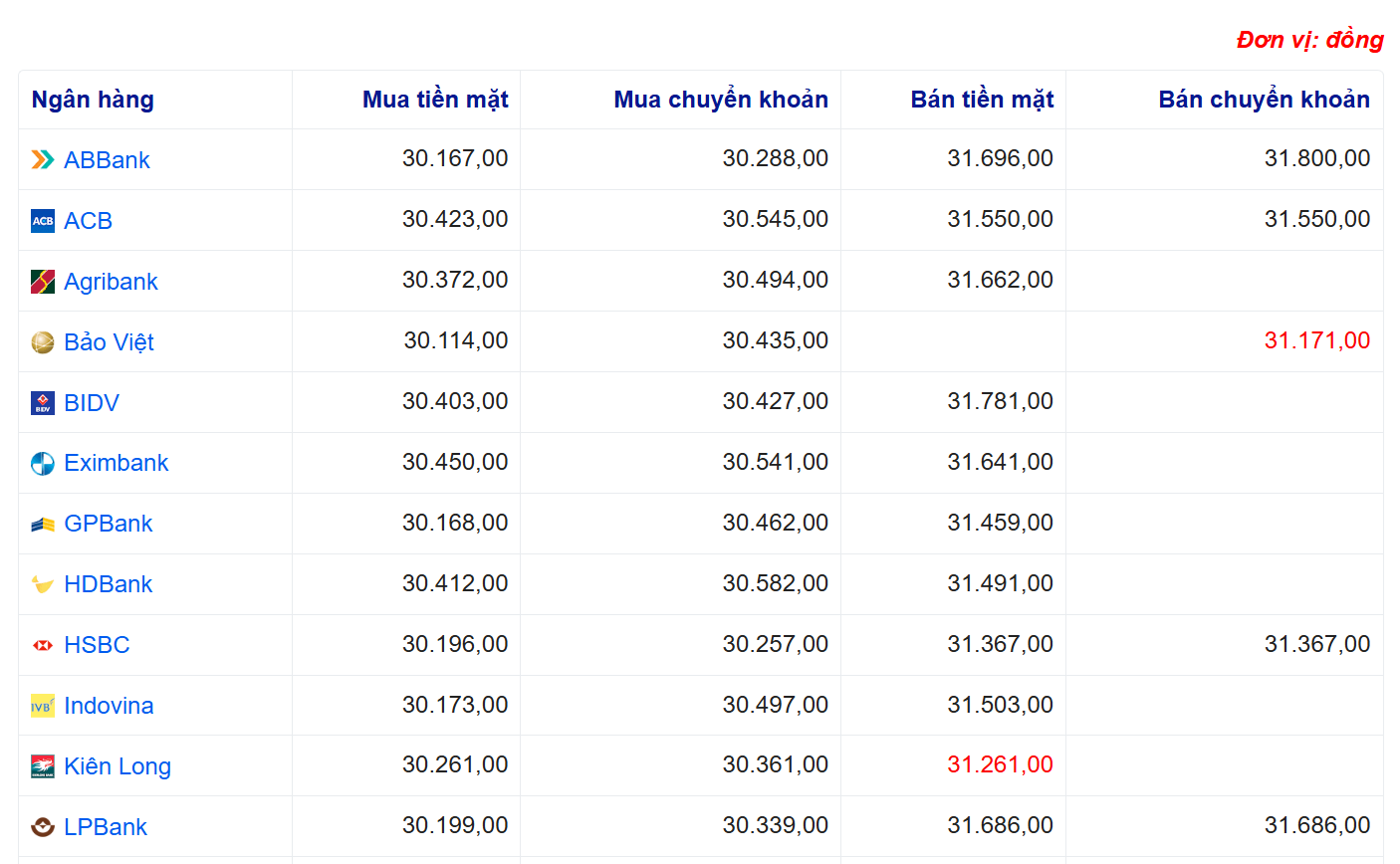 Tỷ giá USD tại Sở giao dịch Ngân hàng Nhà nước niêm yết ở mức 23.848 đồng/USD mua vào và 26.252 đồng/USD bán ra. Tại các ngân hàng thương mại lớn, Vietcombank niêm yết USD ở mức 25.750 – 26.160 đồng/USD (mua vào – bán ra). VietinBank giao dịch quanh 25.630 – 26.170 đồng/USD, còn BIDV niêm yết ở mức 25.745 – 26.125 đồng/USD.