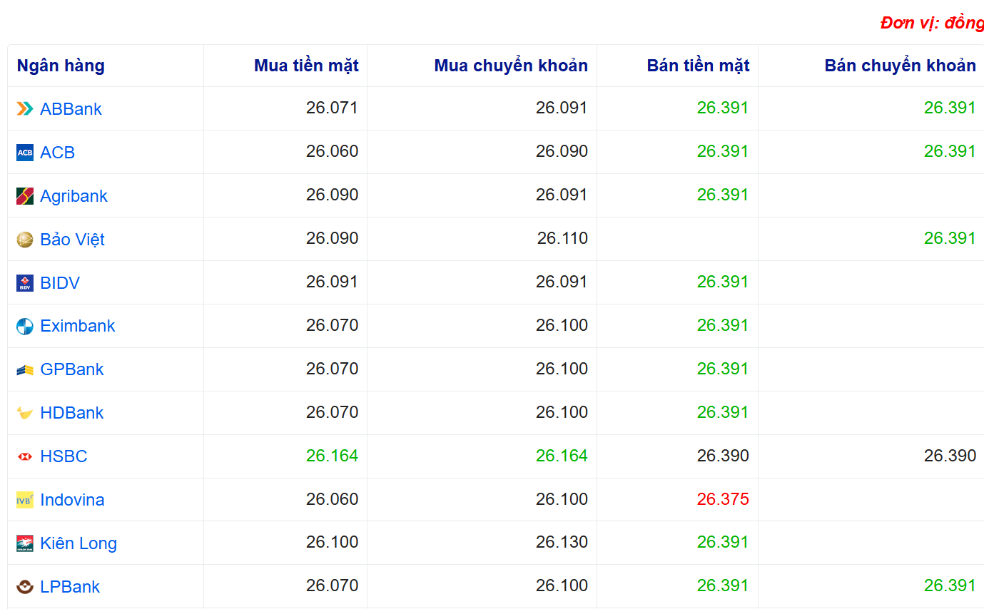Tại các ngân hàng thương mại lớn, tỷ giá USD nhìn chung ổn định, giá mua vào dao động quanh 25.900–26.100 đồng/USD, trong khi giá bán ra phổ biến ở mức 26.391 đồng/USD.