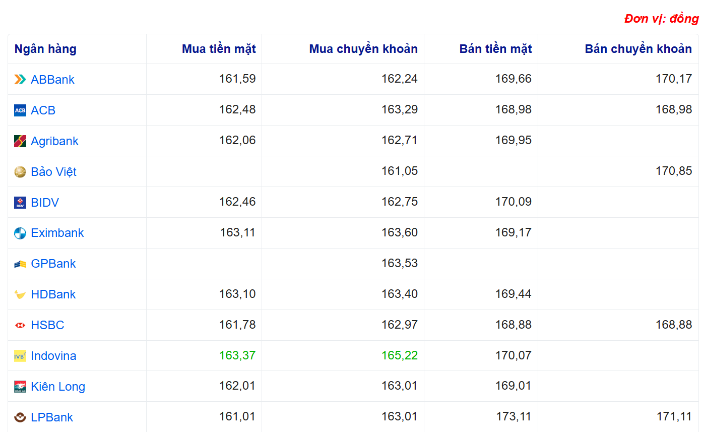 Tỷ giá yên Nhật tại một số ngân hàng: