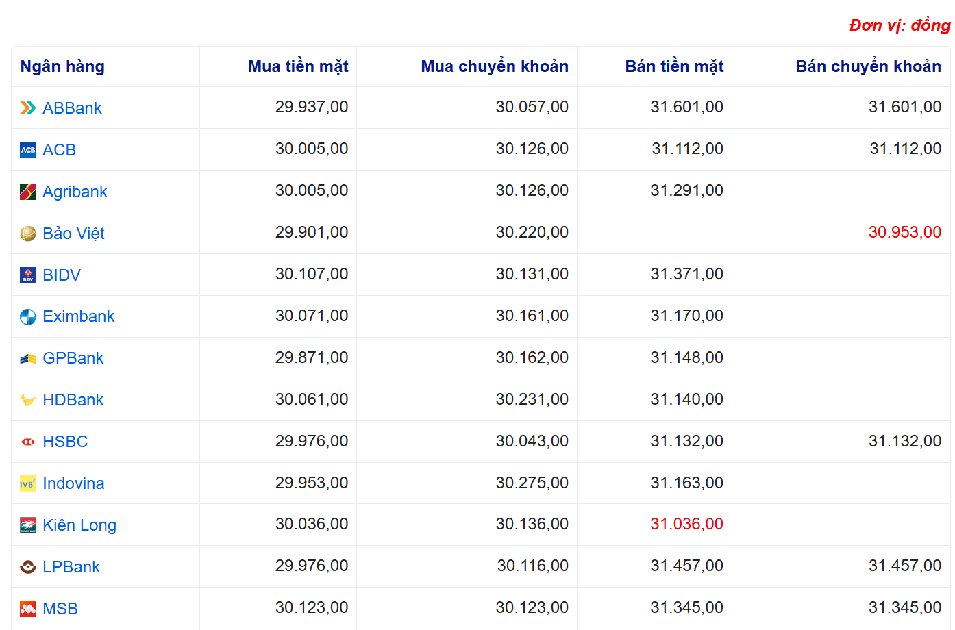 Đối với các ngoại tệ khác, tỷ giá EUR tại Sở giao dịch Ngân hàng Nhà nước tăng lên mức 27.792–30.717 đồng/EUR. Tại các ngân hàng thương mại, giá mua vào EUR phổ biến quanh 29.600–30.100 đồng/EUR, còn giá bán ra dao động trên 31.300 đồng/EUR.