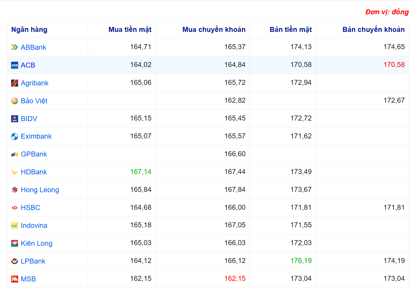 Tỷ giá yên Nhật tại một số ngân hàng: