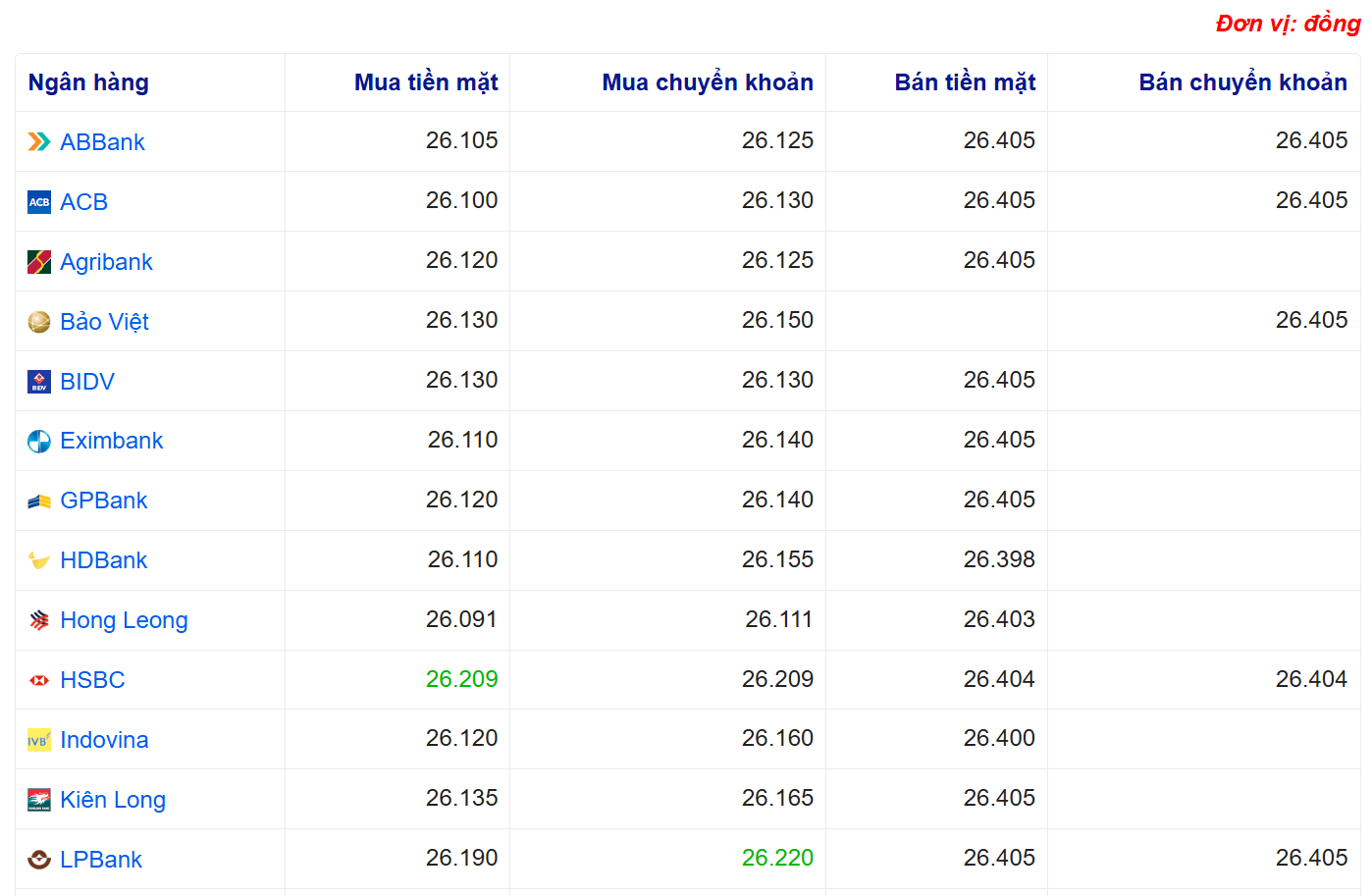 Tại các ngân hàng thương mại, tỷ giá USD hầu như không biến động. Vietcombank niêm yết USD ở mức 26.095 – 26.405 đồng, VietinBank giao dịch quanh 25.955 – 26.405 đồng, trong khi BIDV duy trì mức 26.130 – 26.405 đồng/USD.