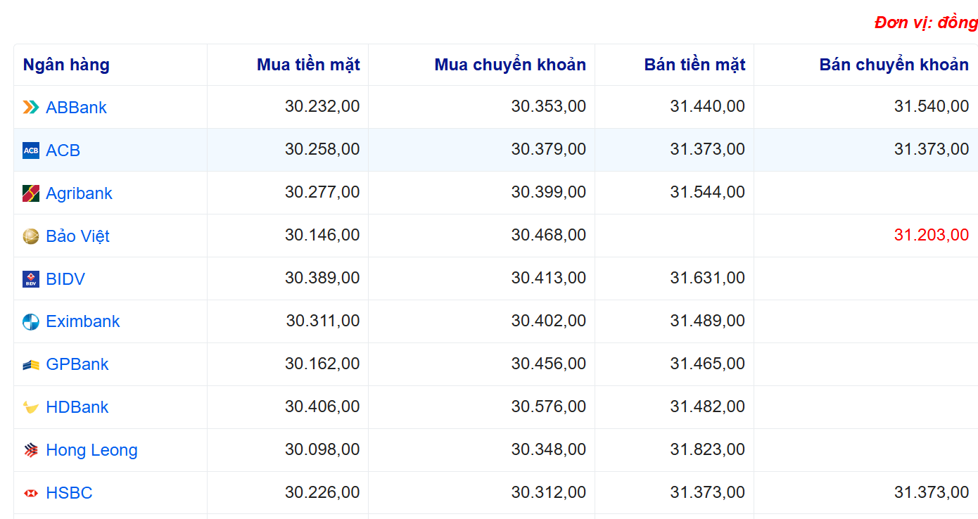 Tỷ giá USD tại một số ngân hàng: