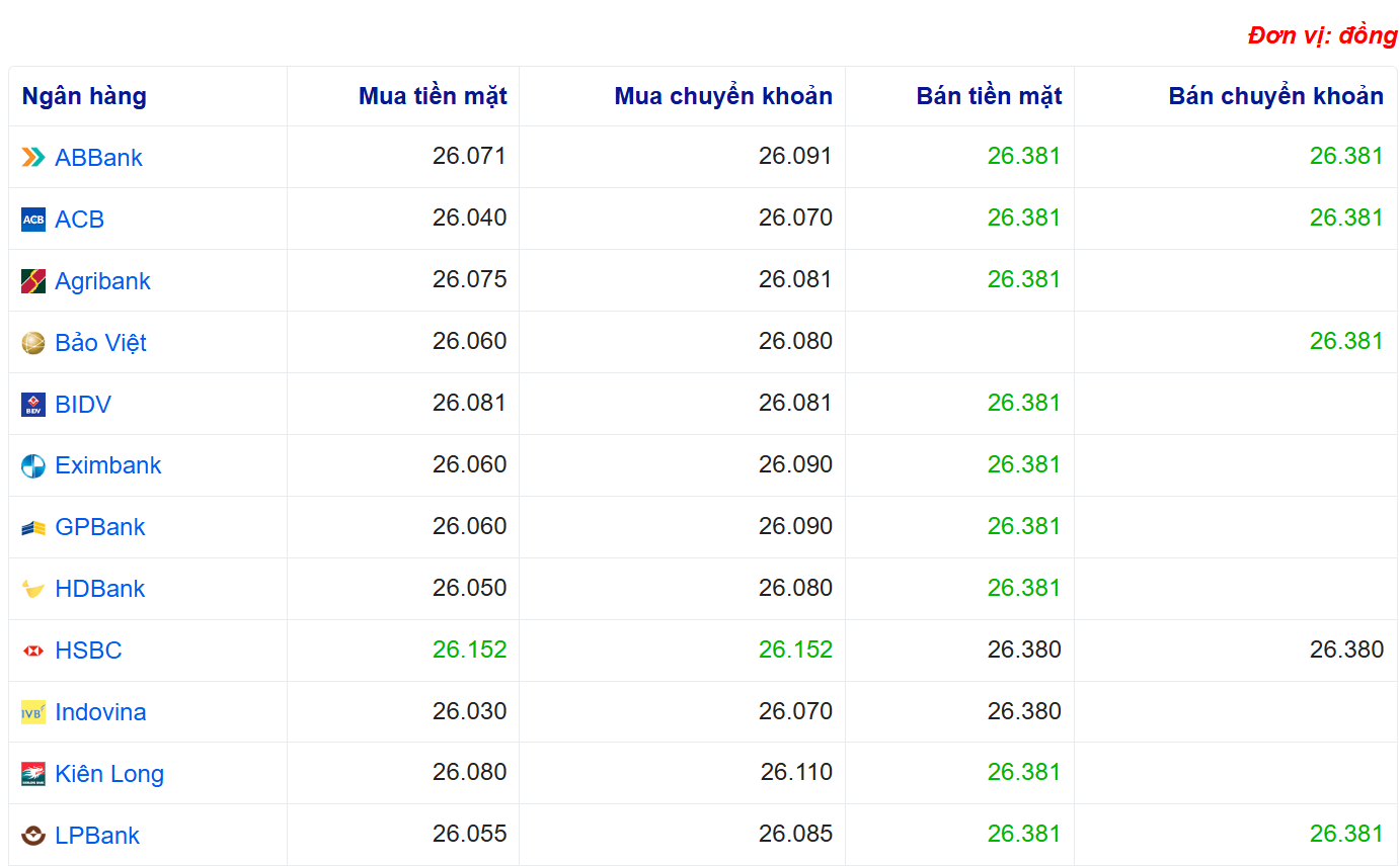 Ở thị trường trong nước, tỷ giá USD nhìn chung ổn định. Tại Sở giao dịch Ngân hàng Nhà nước, giá mua vào – bán ra USD được giữ nguyên ở mức 23.919 – 26.331 đồng/USD. Tại các ngân hàng thương mại lớn, giá USD mua vào phổ biến quanh 25.885 – 26.081 đồng/USD, trong khi giá bán ra duy trì ở mức 26.381 đồng/USD.