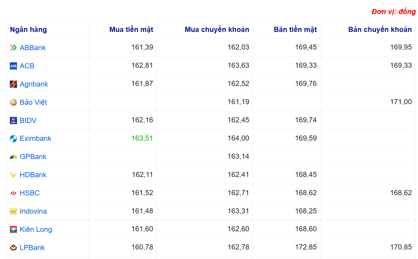 Tỷ giá yên Nhật tiếp tục ổn định với giá mua vào tại các ngân hàng quanh 160 – 162 đồng/JPY và giá bán ra phổ biến dưới 172 đồng/JPY.