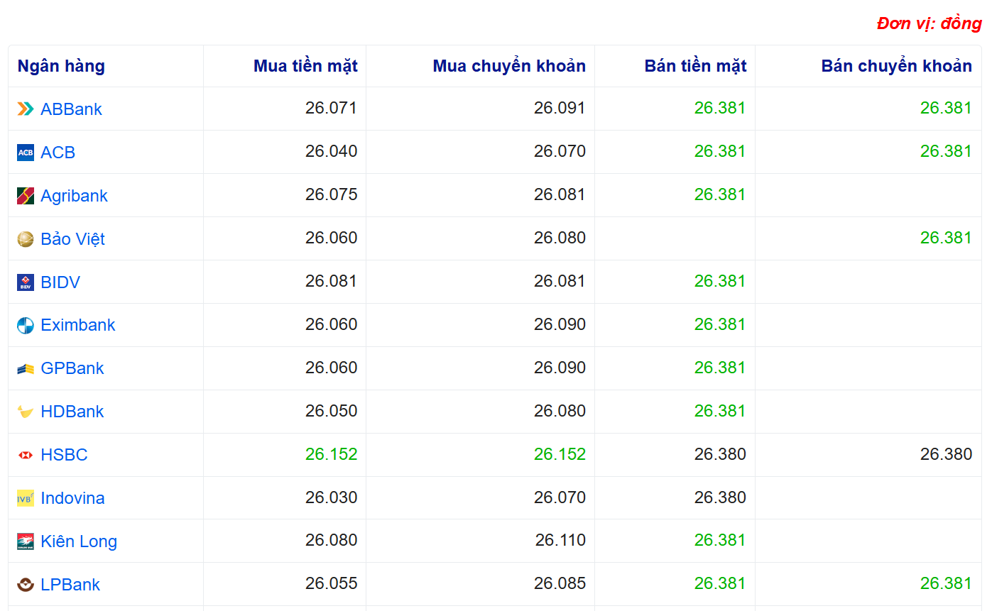 Tại thị trường trong nước, tỷ giá USD nhìn chung ổn định. Tại Sở giao dịch Ngân hàng Nhà nước, tỷ giá mua vào – bán ra USD được giữ nguyên ở mức 23.919 – 26.331 đồng/USD. Tại các ngân hàng thương mại lớn, giá USD mua vào phổ biến quanh 25.885 – 26.081 đồng/USD, trong khi giá bán ra duy trì ở mức 26.381 đồng/USD.