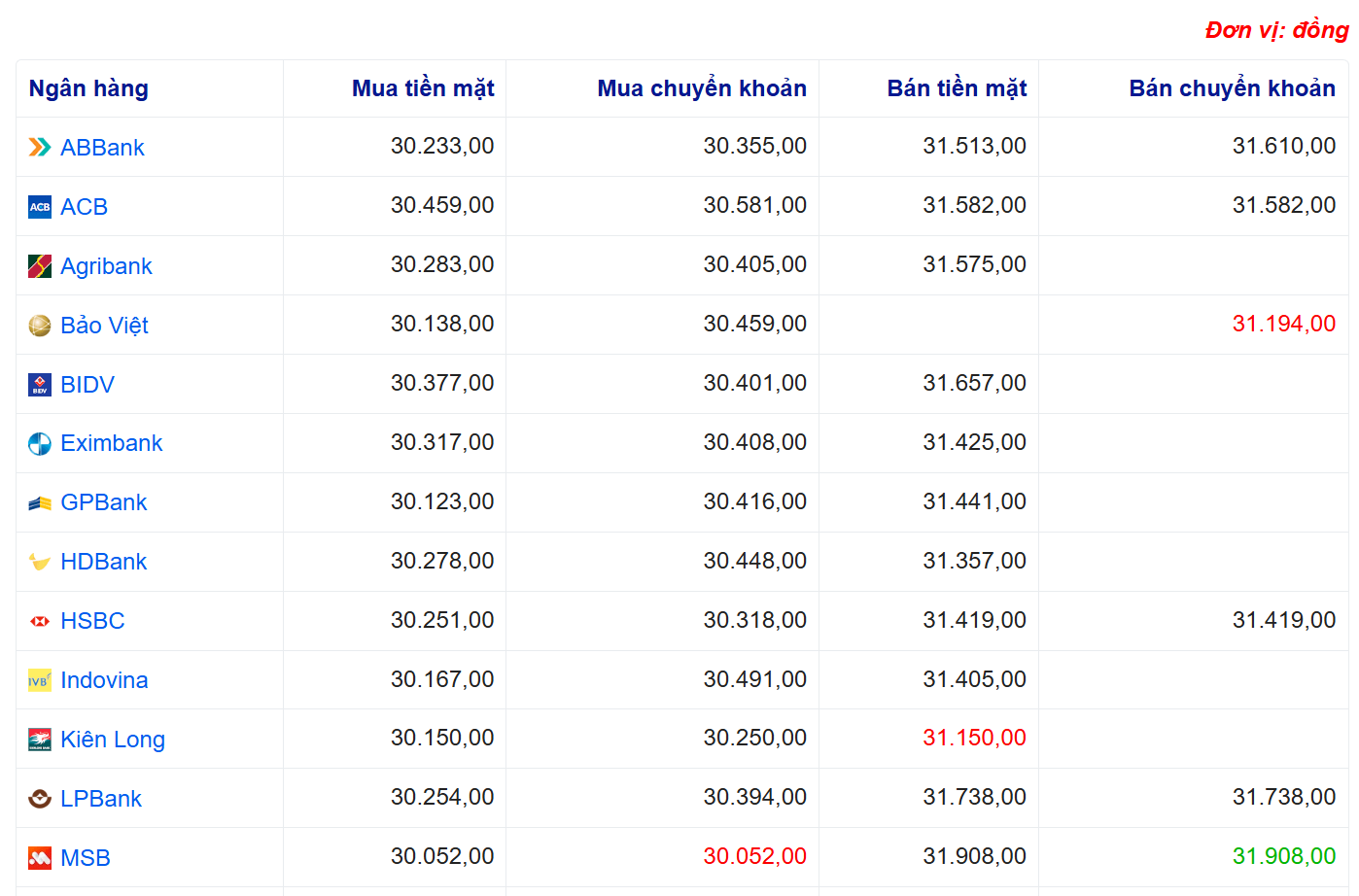 Tỷ giá USD tại một số ngân hàng: