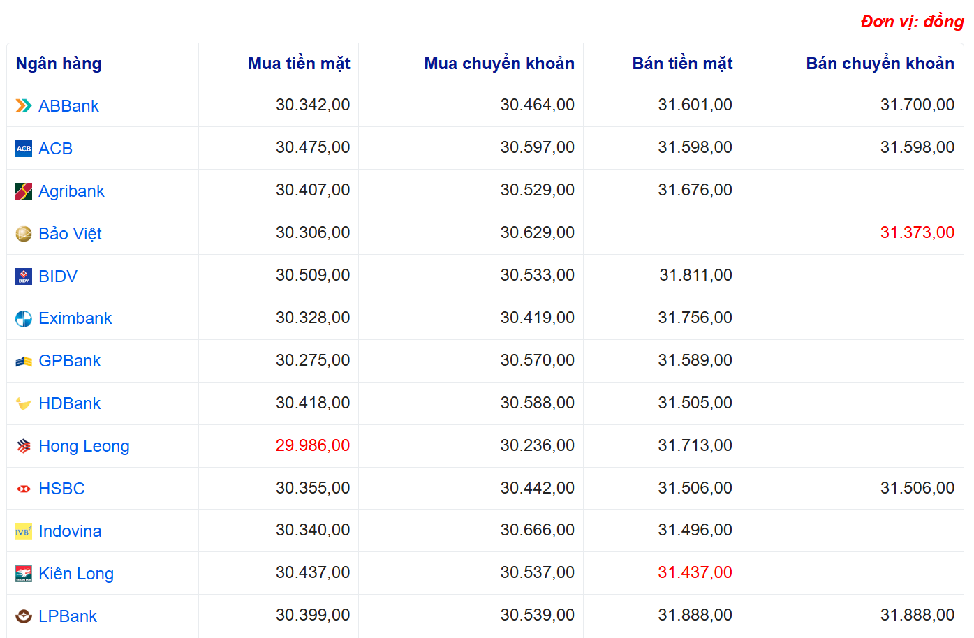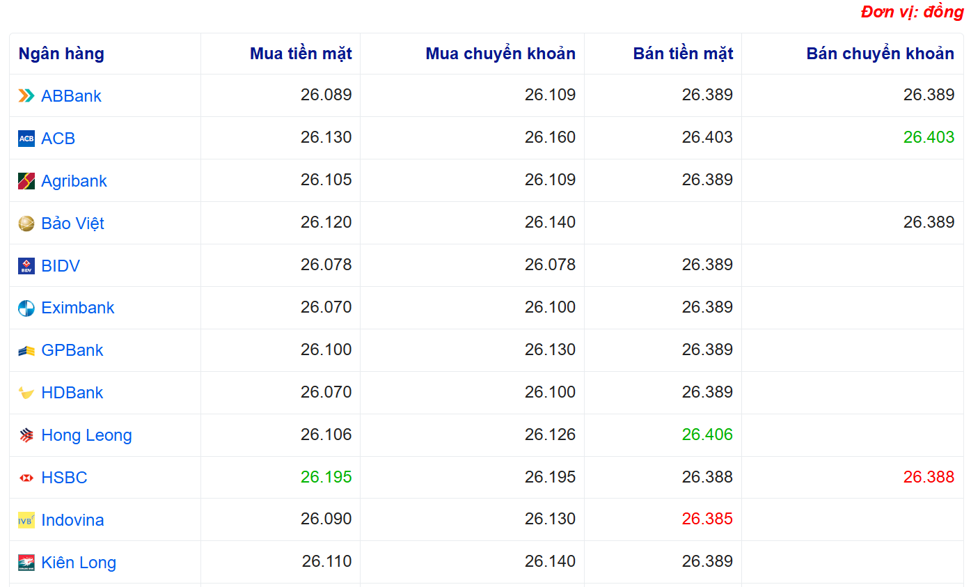 Tỷ giá USD tại một số ngân hàng: