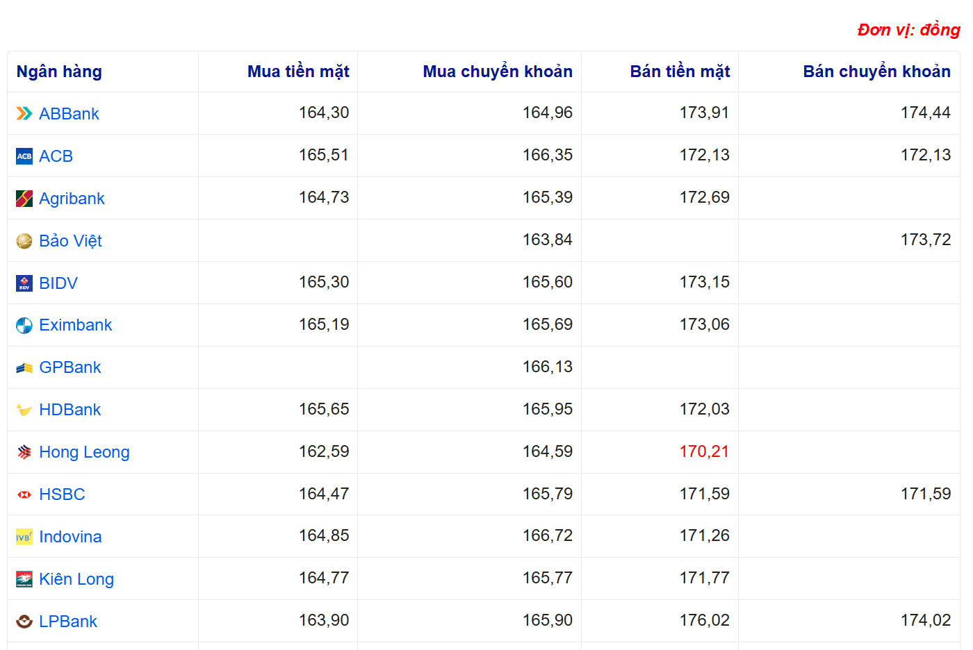 Tỷ giá yên Nhật tại một số ngân hàng: