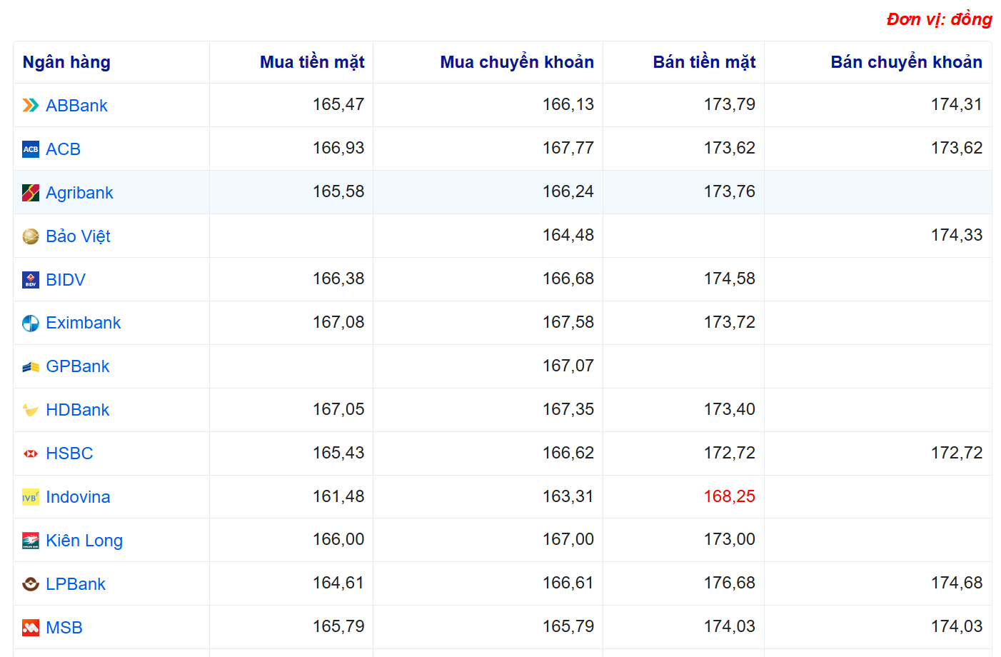 Tỷ giá yên Nhật tại một số ngân hàng: